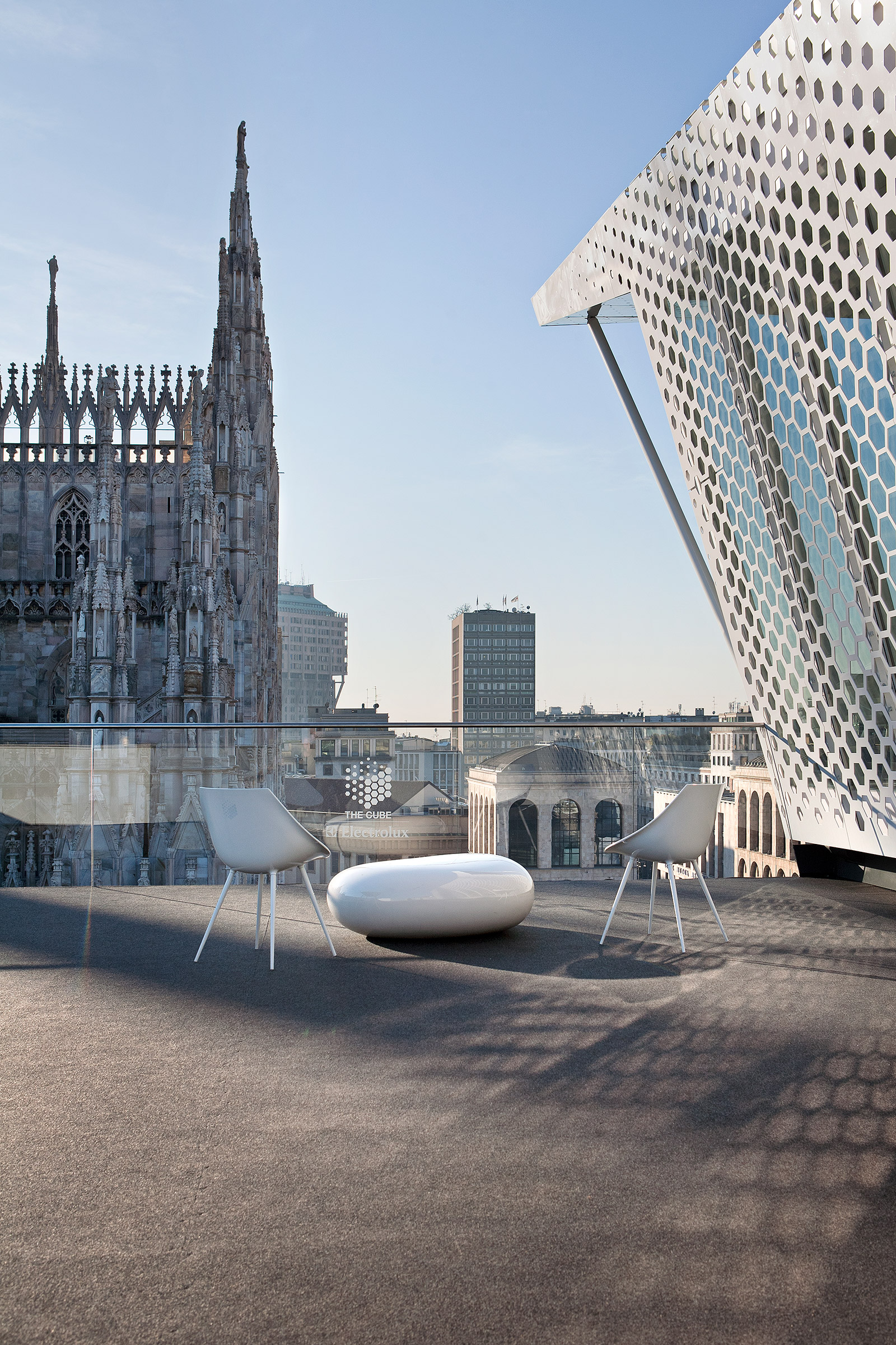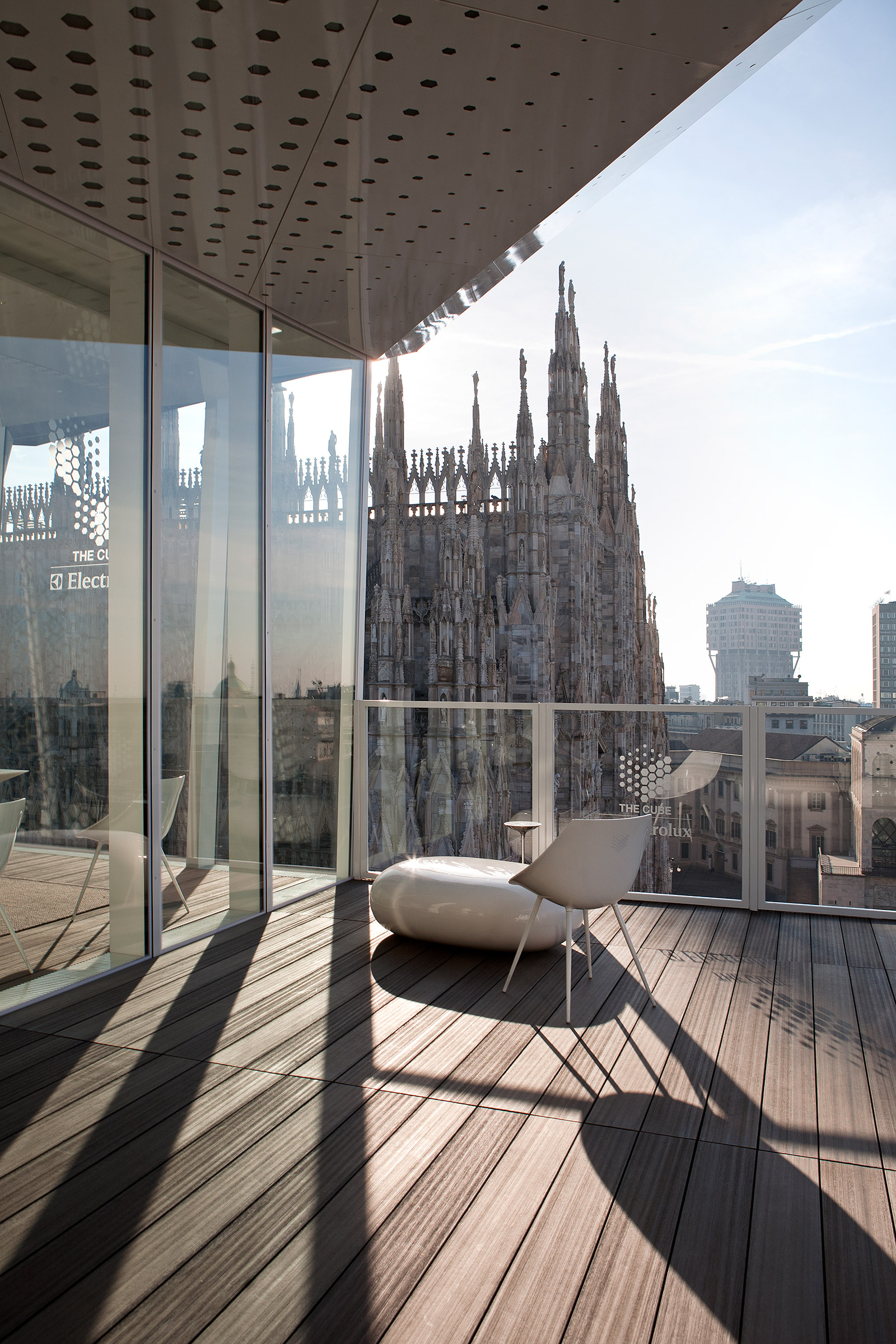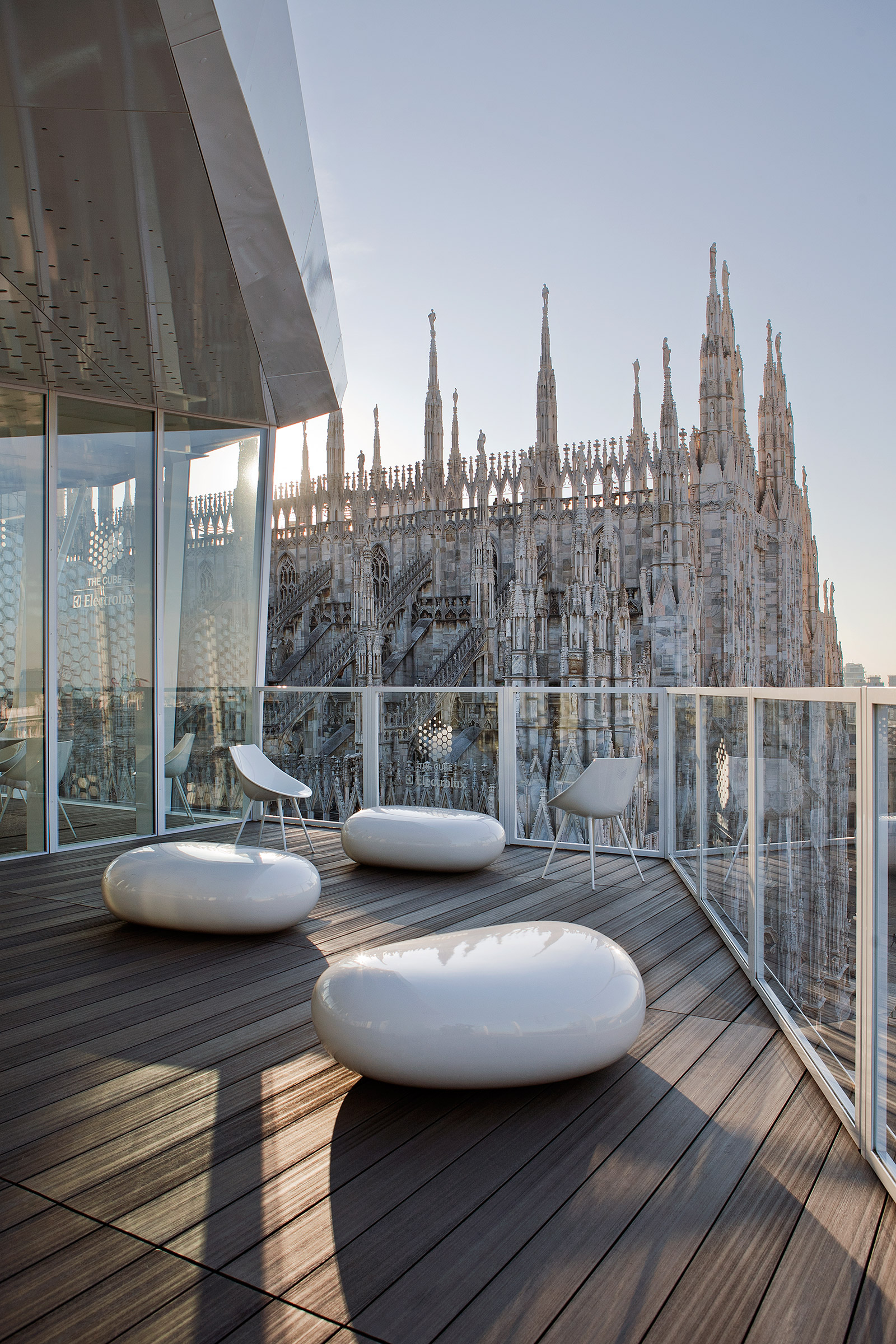 The dining pavilion seats 18 people for lunch or dinner and offers a superlative view of Piazza del Duomo, just a few meters away from the Cathedral’s spires, facing Palazzo Reale and the Arengario, the area hosting the new Museo del Novecento.