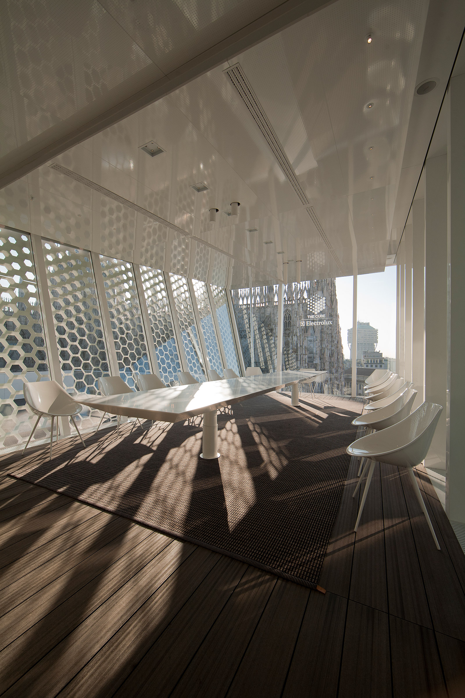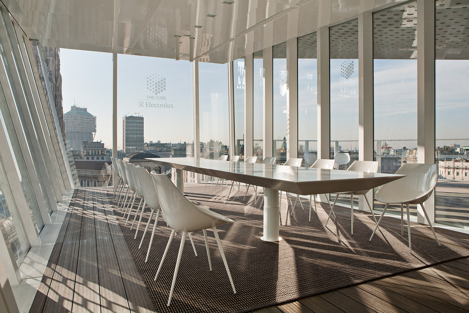 The interior of the the Cube has been designed to accommodate various configurations; the pavilion consists of a large open space with a visible kitchen and a single large table that can disappear by raising it to the ceiling, allowing space for a lounge area after dinner. The total floor area of 140 sqm is divided between the open space and a 50 sqm terrace. The employed materials are highly innovative in terms of technology, eco-sustainability and energy saving, as well as constantly reusable.